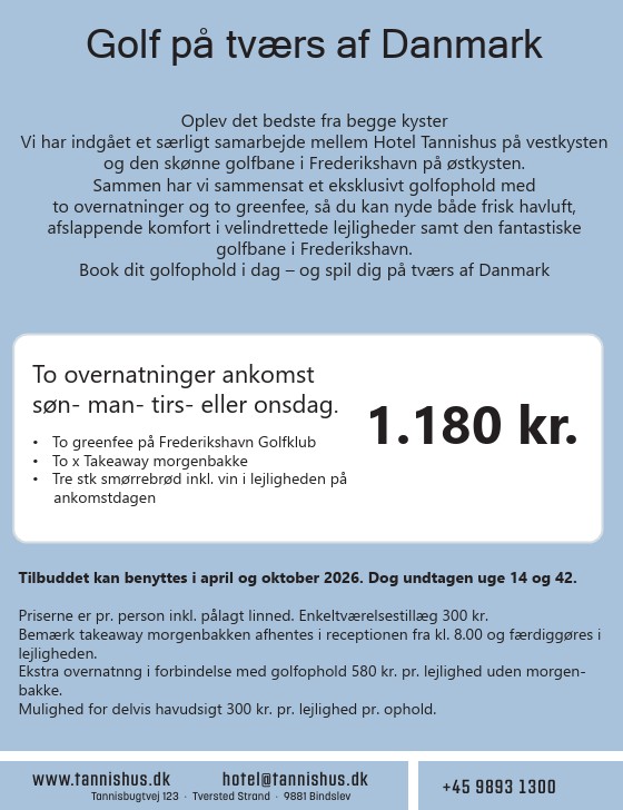 Hotell ved Vesterhavet i vakre omgivelser. Her på Hotel Tannishus tar vi deg nærmere naturen ved Vesterhavet og hvor oppholdet inkluderer greenfee på Frederikshavn Golfklubb.